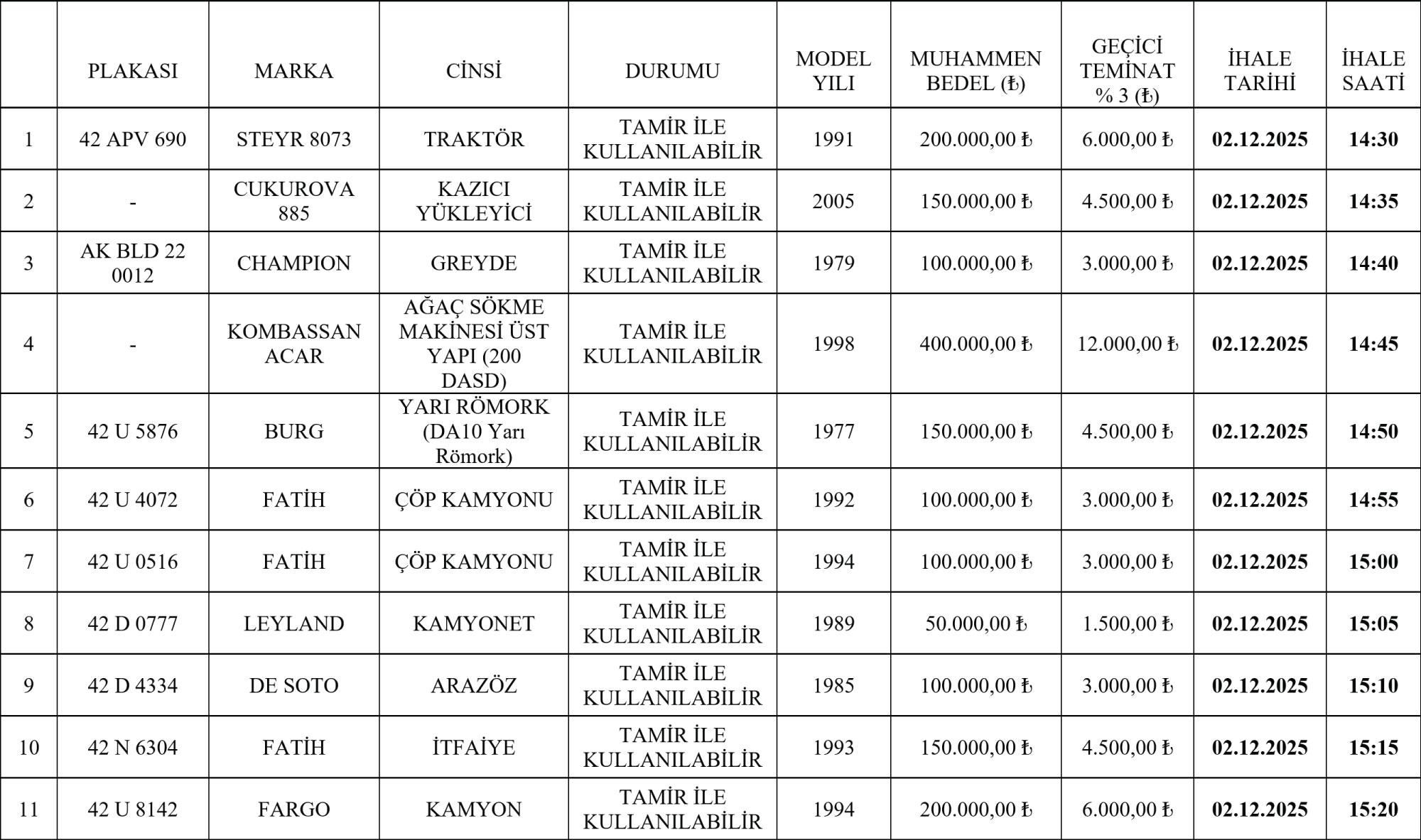 1. Belediyemize ait hizmet dışı olarak kullanılmayan aşağıda plakaları, marka, cinsi, modeli, muhammen bedel ve geçici teminat tutarları belirtilen 10 adet tamir ile kullanılabilir motorlu araç ve 1 adet tamir ile kullanılabilir Üst Yapı, 2886 Sayılı Devlet İhale Kanunu’nun 35-c ve 45. 46. 47. Maddeleri hükümlerine göre açık teklif usulüyle satılacaktır. İhale konusu satılacak araçların muhammen bedeli, geçici teminat miktarı, ihale saatleri ve araçların özellikleri aşağıdaki gibidir.