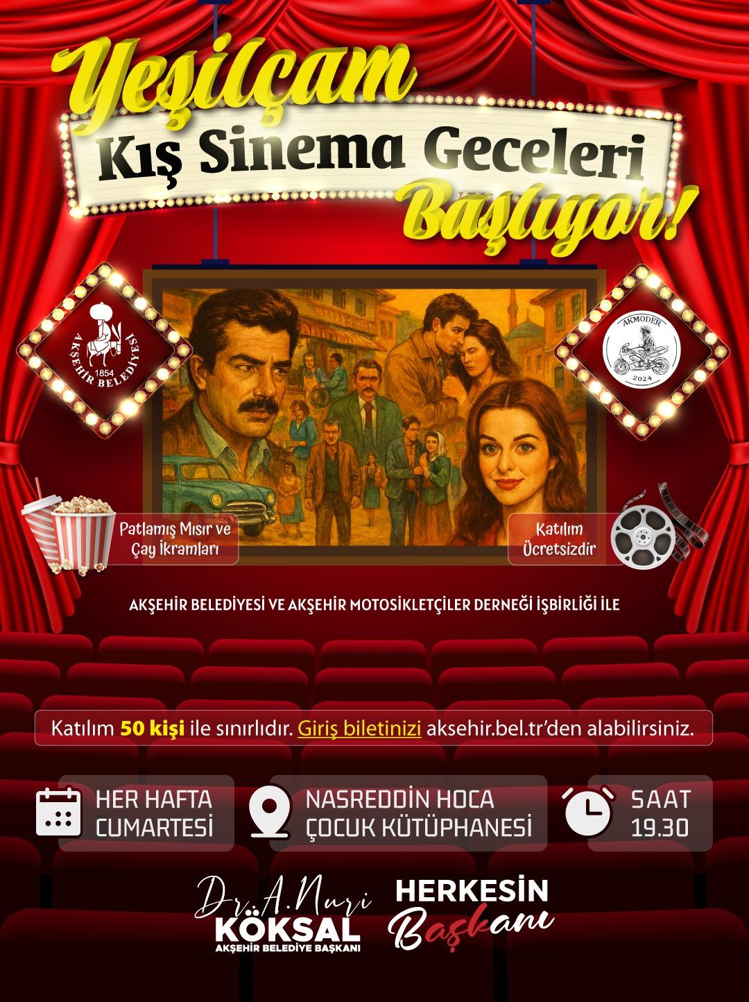 Akşehir Belediyesi, kültür ve sanat etkinlikleri kapsamında kış aylarına özel anlamlı bir projeyi daha hayata geçiriyor. Akşehir Belediyesi ve Akşehir Motosikletçiler Derneği iş birliğinde düzenlenen ‘Yeşilçam Kış Sinema Geceleri’, Türk Sinemasının hafızalara kazınan yapımlarını Akşehirli sinemaseverlerle buluşturacak.