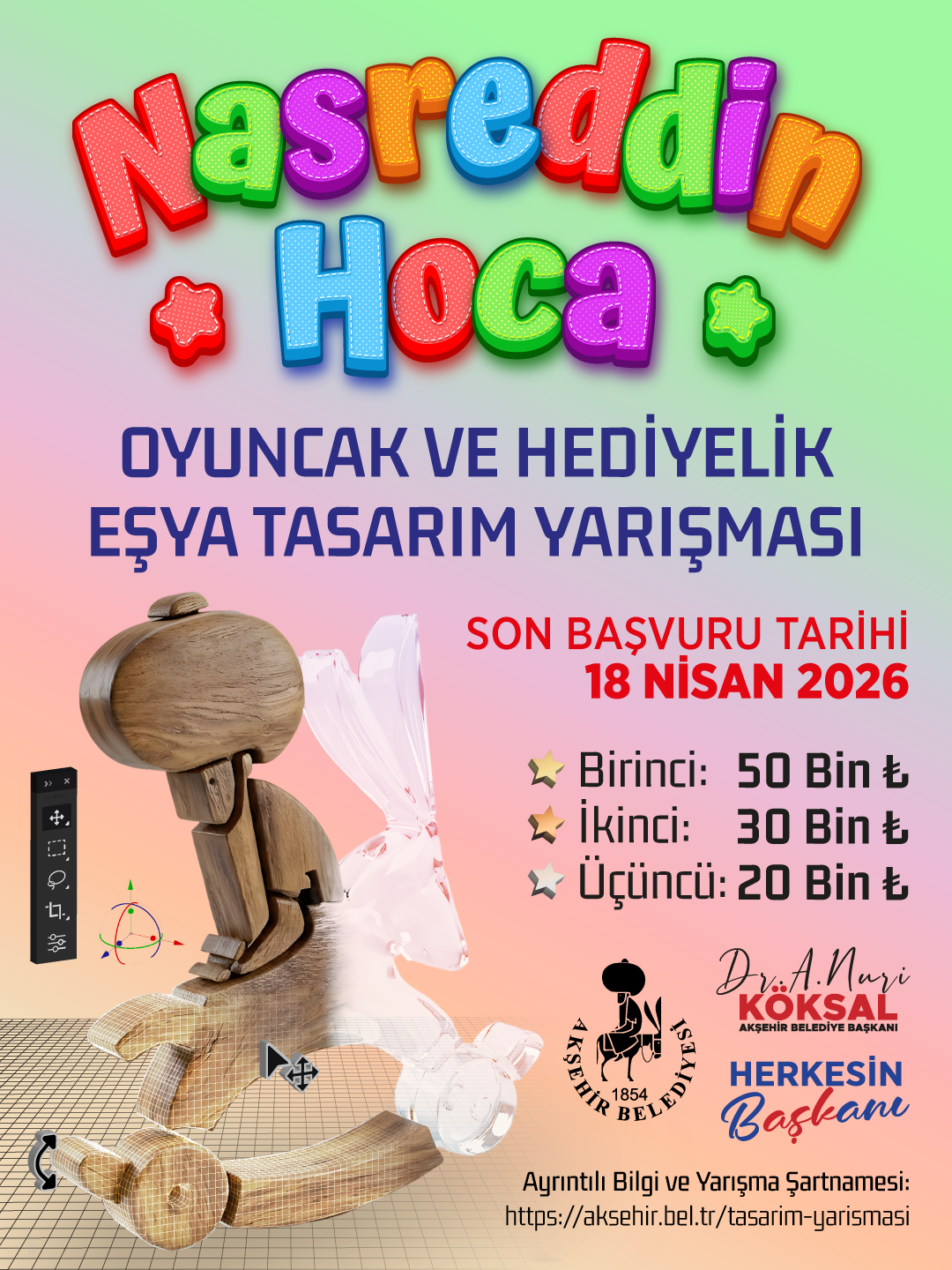Nasreddin Hoca’nın mizahı bu kez oyuncak ve hediyelik eşya tasarımlarıyla hayat buluyor. Akşehir Belediyesi, kültürel mirası çağdaş tasarımla buluşturacak “Nasreddin Hoca Oyuncak ve Hediyelik Eşya Tasarım Yarışması’nı” hayata geçiriyor. Nasreddin Hoca’nın mizahını ve bilgelik geleneğini günümüz tasarım diliyle yorumlamak isteyen herkese açık olan yarışma için başvurular 18 Şubat tarihinde başlayacak ve 18 Nisan 2026’ya kadar devam edecek.