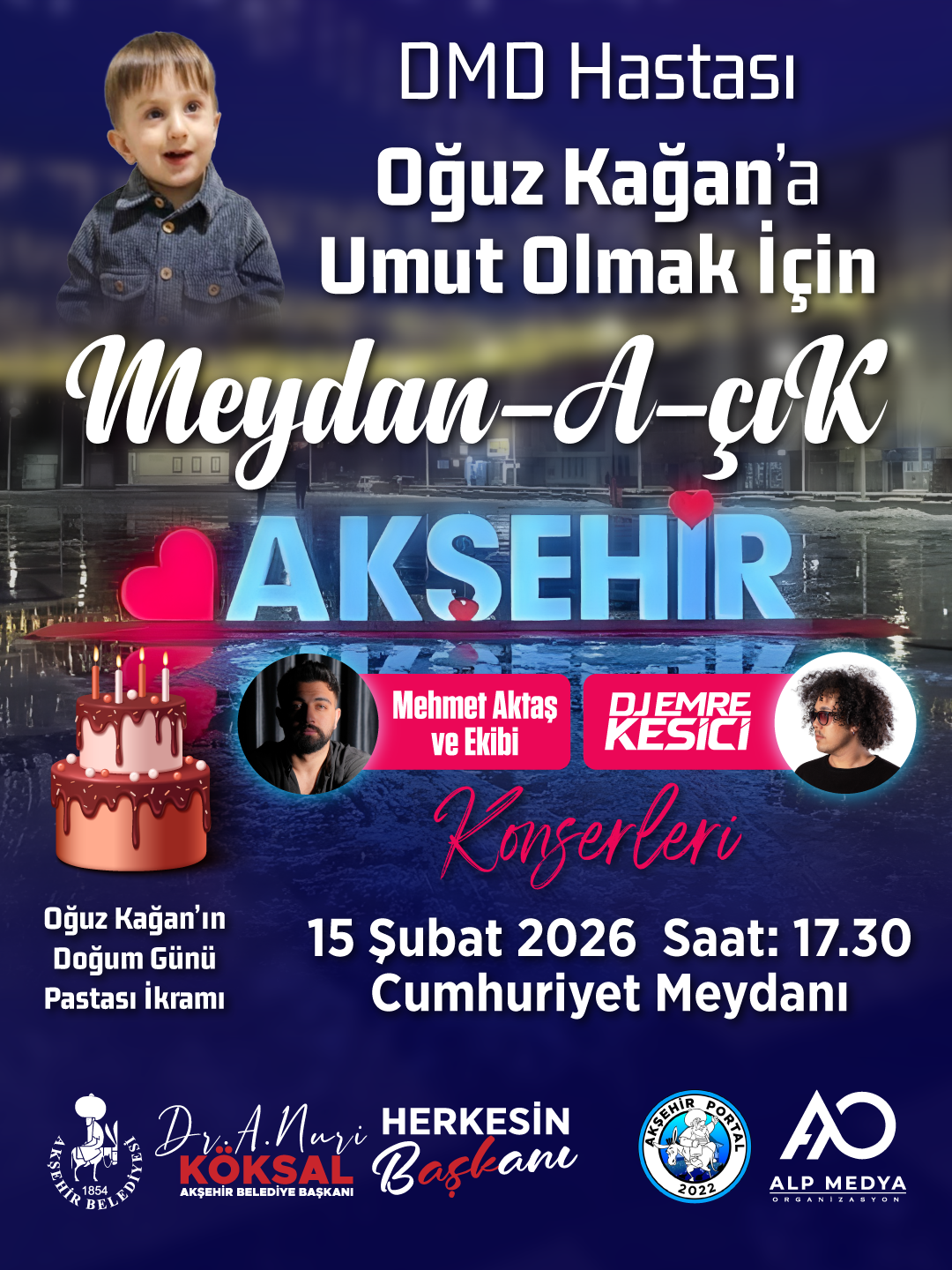 Akşehir Belediyesi öncülüğünde hayata geçirilecek programda Mehmet Aktaş ve ekibi sahne alırken, DJ Emre Kesici performansıyla etkinliğe renk katacak. Program kapsamında Oğuz Kağan’ın doğum günü de kutlanacak ve katılımcılara pasta ikramı yapılacak. Hem müzik hem de dayanışma duygusunun ön planda olacağı etkinlikte, Akşehirliler tek yürek olacak.