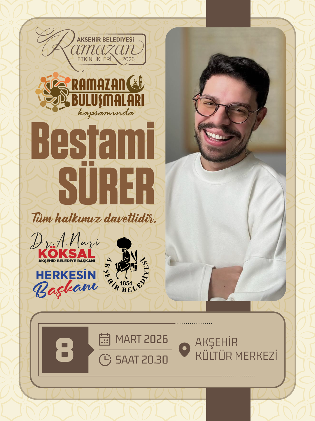 Tasavvufi sohbetleri ve samimi anlatımıyla bilinen Sürer, Ramazan’ın kalpleri yumuşatan, insanı iç dünyasına yönelten yönünü ele alacak. Kardeşlik, sabır, şükür ve maneviyat ekseninde gerçekleşecek programda, katılımcılar Ramazan’ın ruhunu daha derinden hissetme imkânı bulacak.