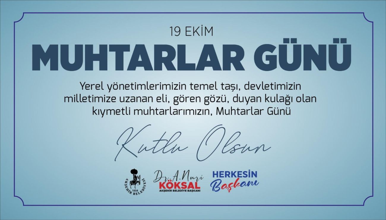 Bu vesileyle, görevini fedakârca yürüten tüm muhtarlarımızın 19 Ekim Muhtarlar Günü’nü en içten dileklerimle kutluyor; kendilerine sağlık, huzur ve başarı dolu bir ömür diliyorum.