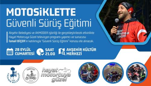 Akşehir Belediyesi ve AKMODER iş birliği ile düzenlenen “Motosiklette Güvenli Sürüş Eğitimi” 28 Eylül Cumartesi günü, saat 21.00’de Akşehir Kültür Merkezi’nde düzenlenecek. Eğitimin konuk konuşmacısı, ‘Hayat Motorcuya Güzel’ televizyon programının yapımcısı ve sunucusu İsmail Biçer olacak.