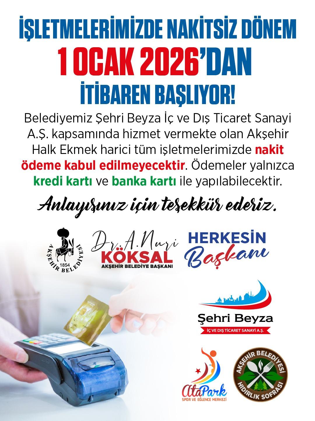 Akşehir Belediyesi, belediyeye bağlı işletmelerde ödeme sistemine ilişkin önemli bir düzenlemeyi hayata geçiriyor. Belediyenin iştiraki olan Şehri Beyza İç ve Dış Ticaret Sanayi A.Ş. bünyesinde hizmet veren Akşehir Halk Ekmek hariç bütün işletmelerde, 1 Ocak 2026 tarihinden itibaren nakit ödeme kabul edilmeyeceği duyuruldu. Ödemelerin ise banka veya kredi kartı ile yapılabileceği belirtildi.