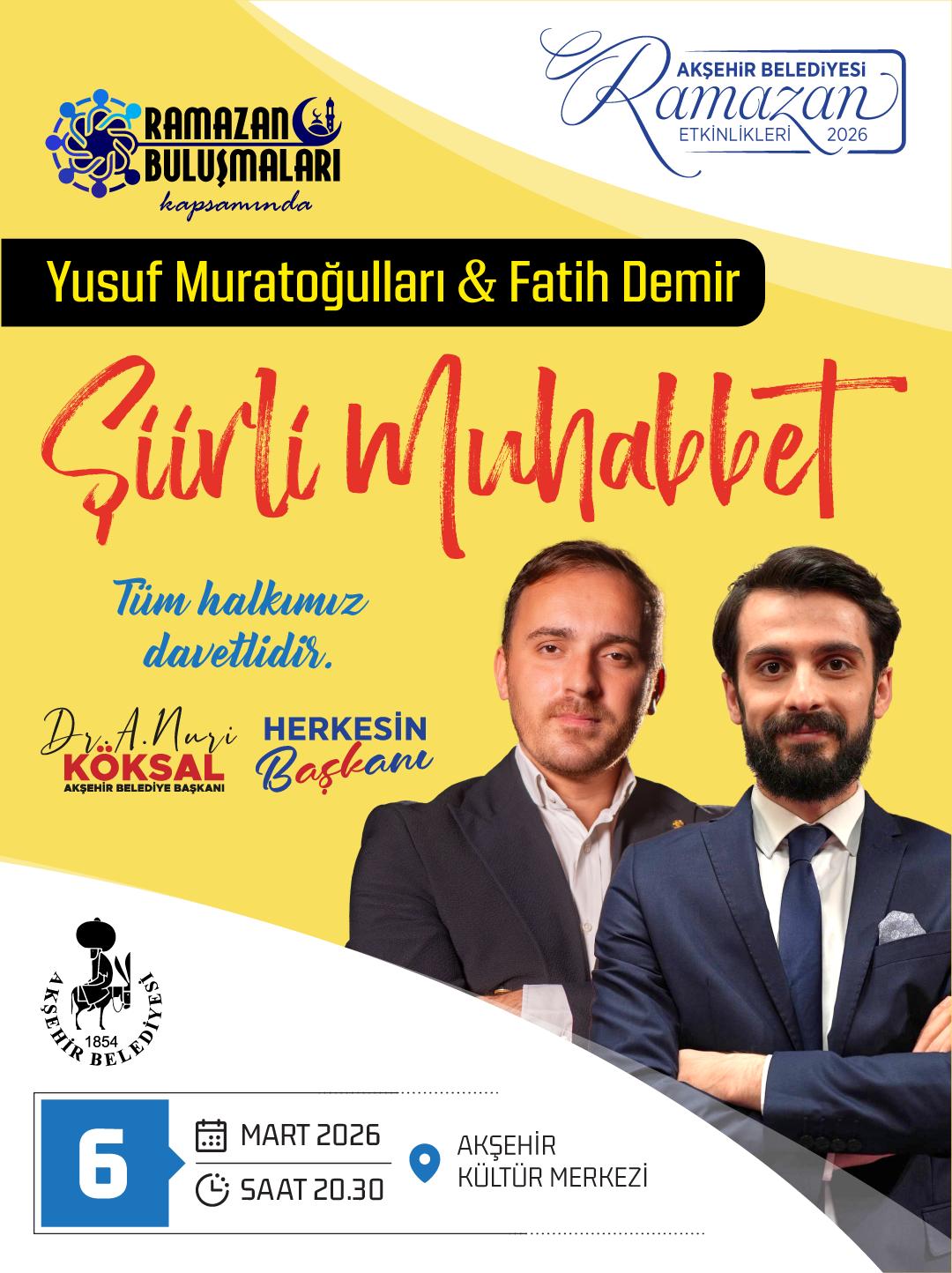 Ramazan etkinliklerinin açılış programı, 6 Mart Cuma akşamı saat 20.30’da Akşehir Kültür Merkezi’nde gerçekleştirilecek.