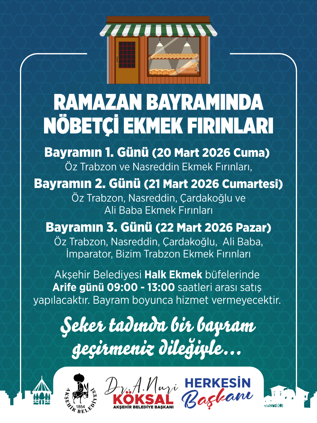 Akşehir Belediyesi, Ramazan Bayramı süresince vatandaşların ekmek ihtiyacını karşılayabilmesi için hizmet verecek olan nöbetçi fırın listesini yayımladı. Hazırlanan programa göre bayramın 1, 2 ve 3. günü şehrin farklı noktalarındaki fırınlar nöbetleşe çalışacak.
